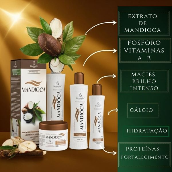 O extrato de mandioca é um ingrediente natural muito usado em máscaras capilares e tônicos porque é rico em vitaminas do complexo B, vitamina C, cálcio, fósforo e carboidratos. Ele é considerado um fortalecedor e revitalizam-te natural para os fios.